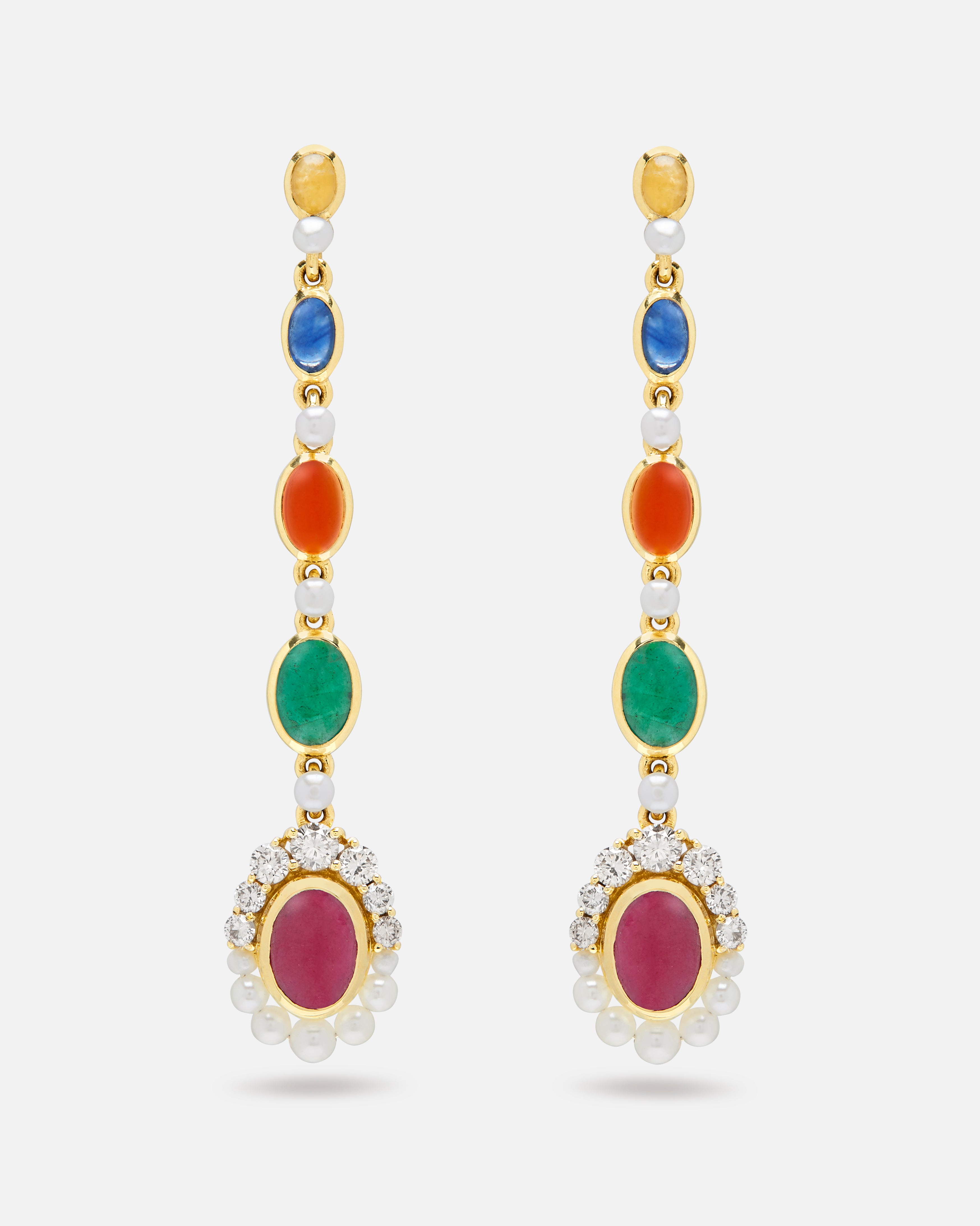 18K yellow gold Navratna Drop Earrings with Diamonds, Pearls, Yellow Sapphires, Blue Sapphires, Red Onyx, and Emerald Navratna earrings.