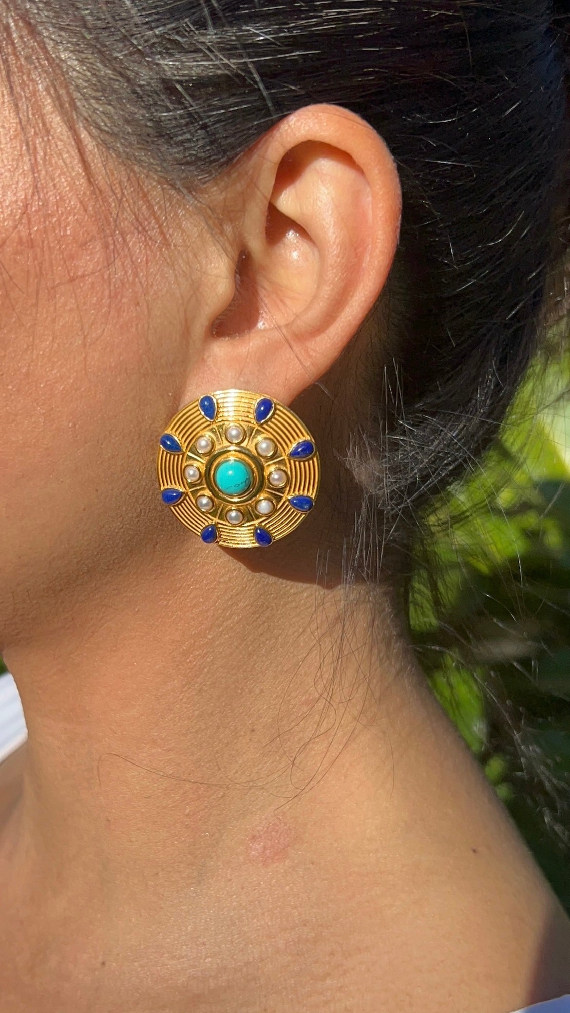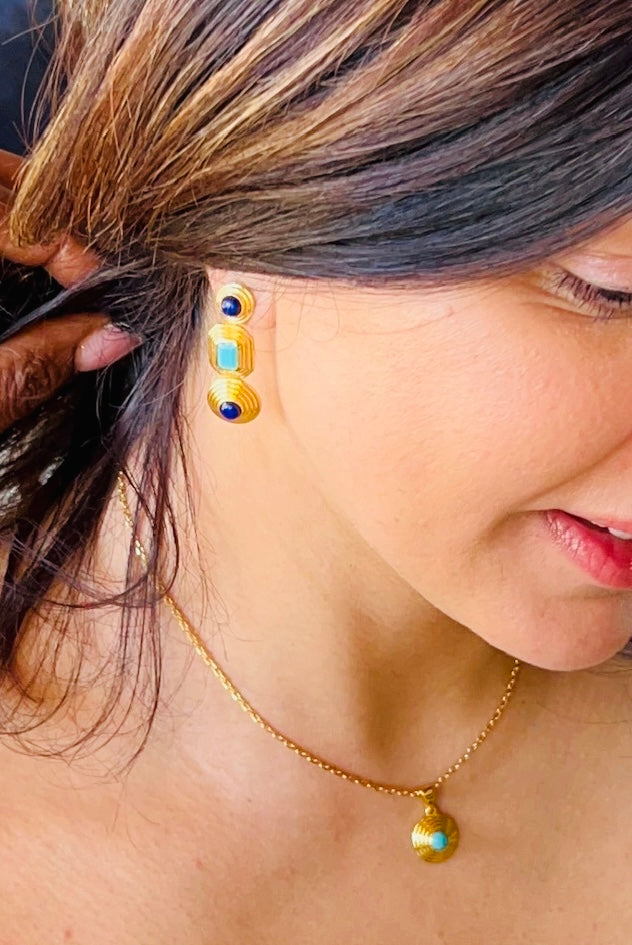 Amulet Earrings with Turquoise, Lapis & Pearl – 24K Gold-Plated Sterling Silver