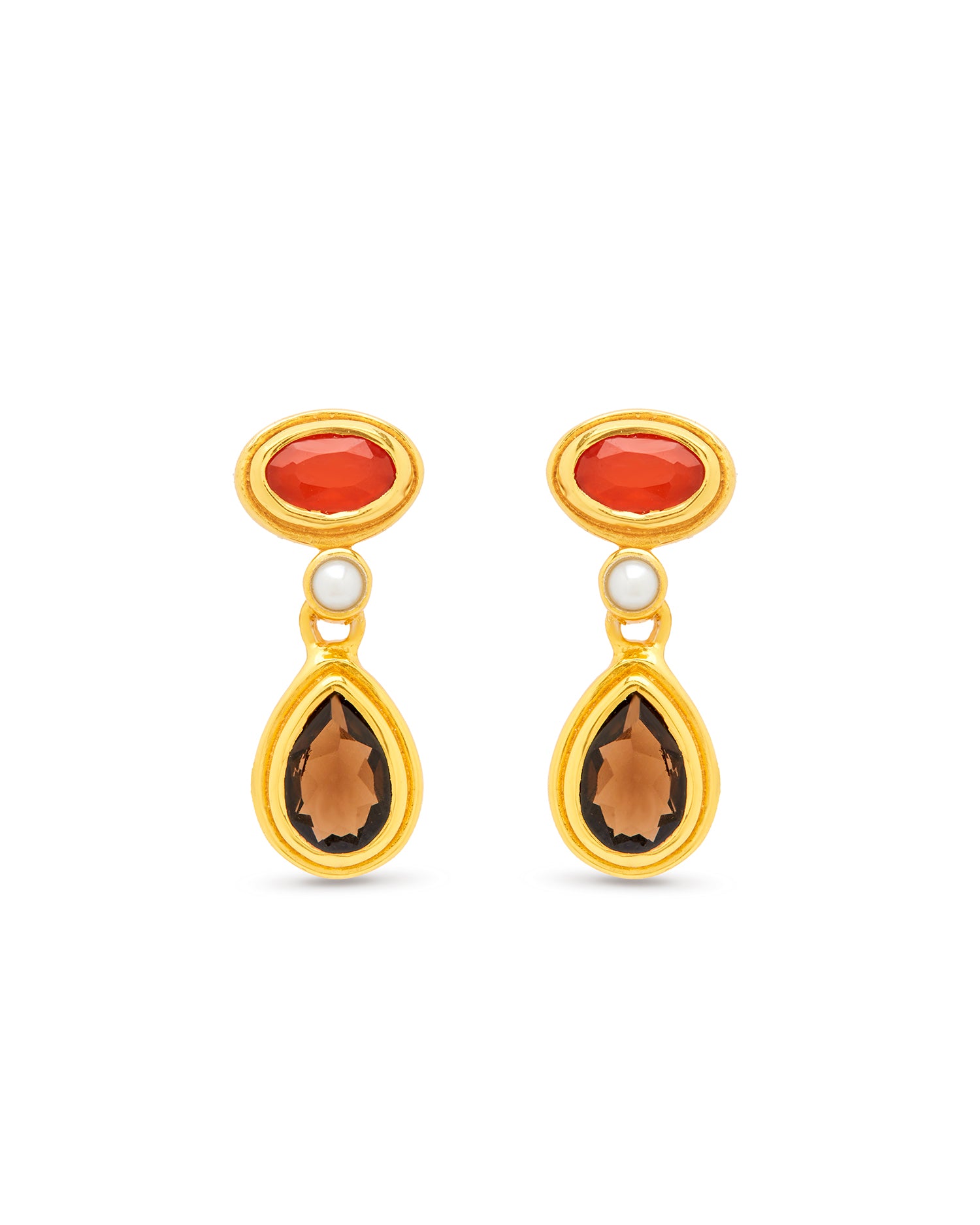 Anya Drop Earrings with Red Onyx, Smokey Quartz & Pearl – 24K Gold-Plated Sterling Silver
