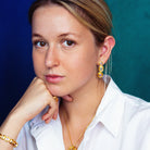 Wear the Nila Earrings with a sleek up-do or tucked-behind-the-ear hairstyle so the drop design shines. Pair with a matching turquoise or lapis accent ring or bangle to tie together the look. For special occasions, let them be the focal point with a minimalist neckline and a monochrome outfit to let the colours pop.