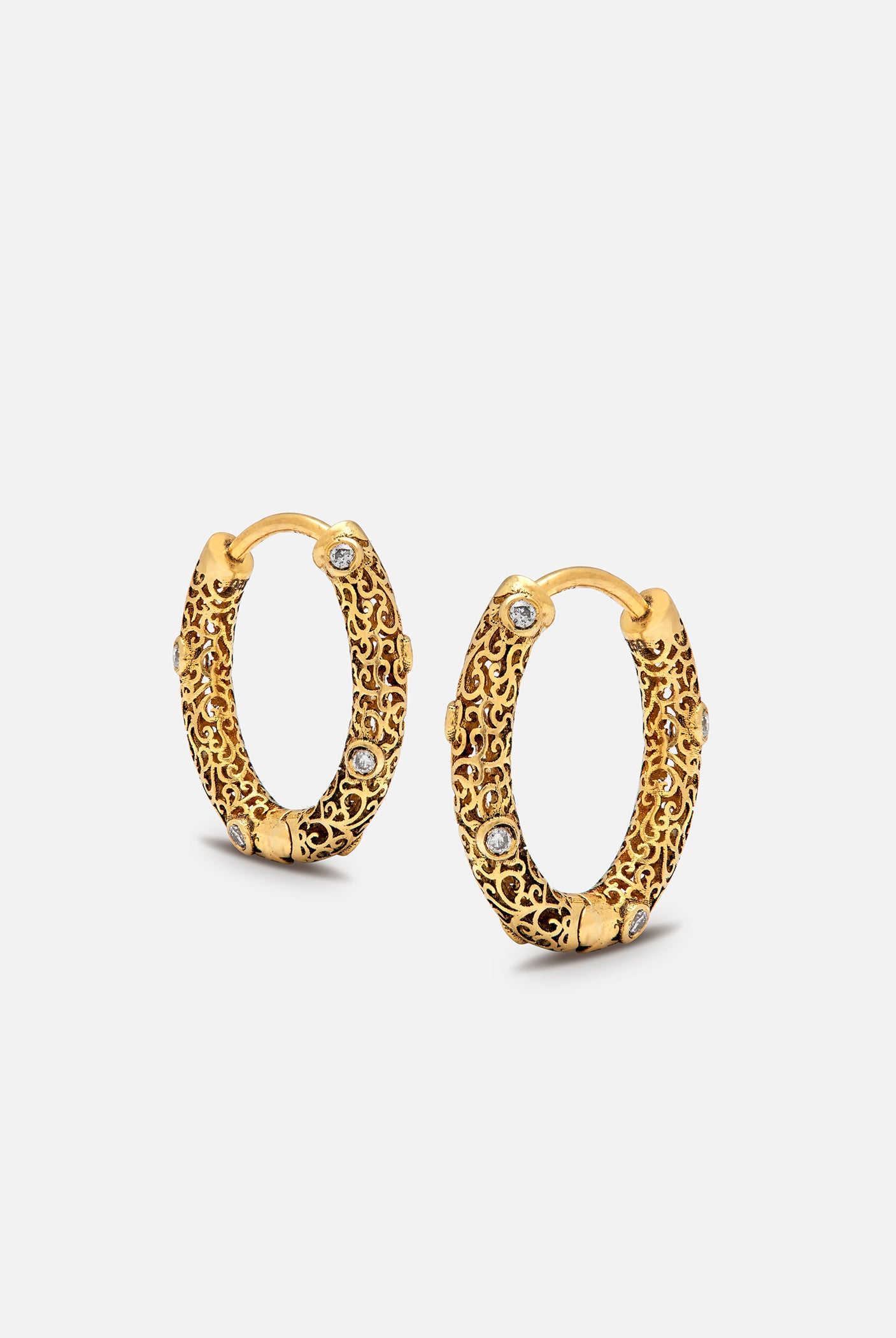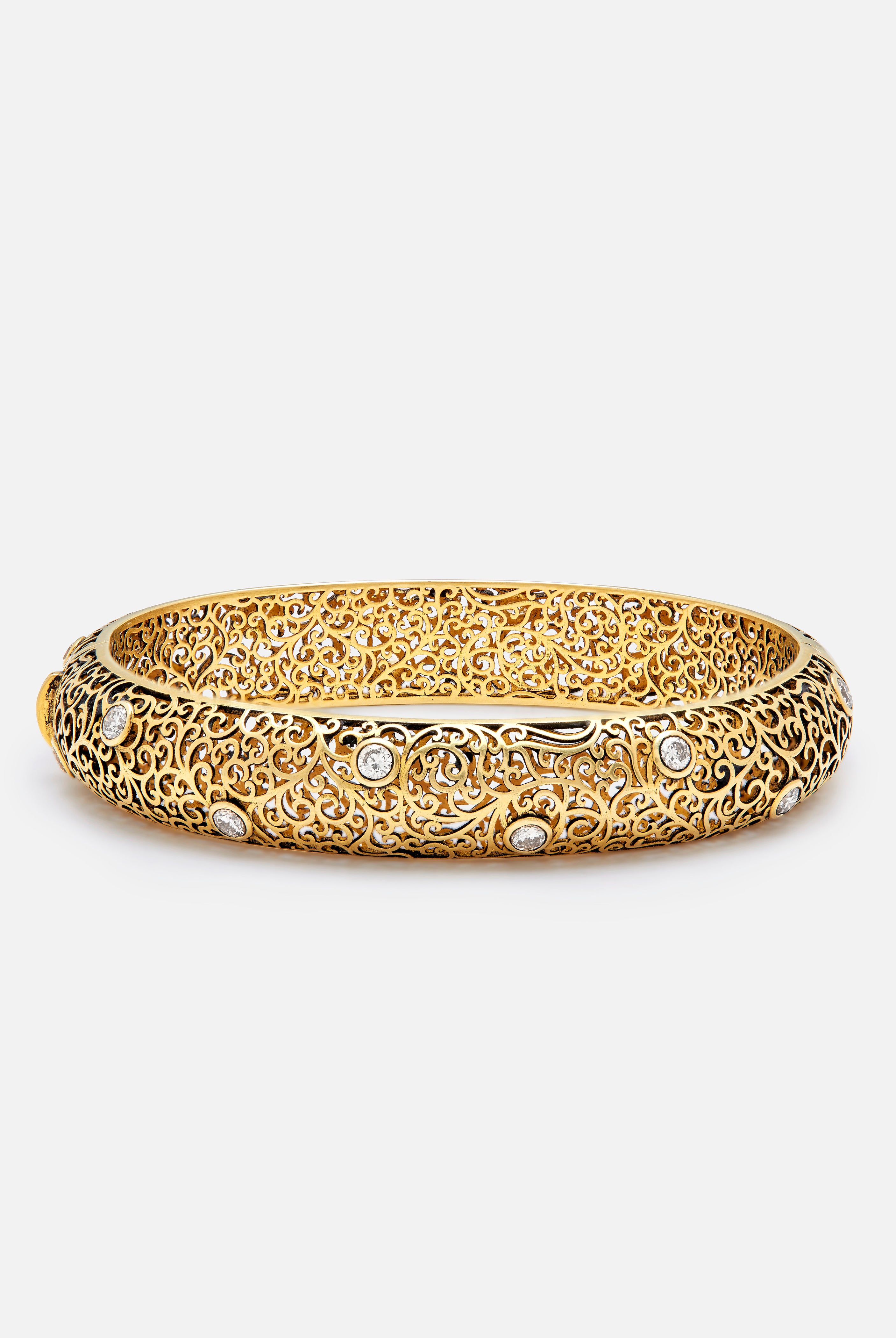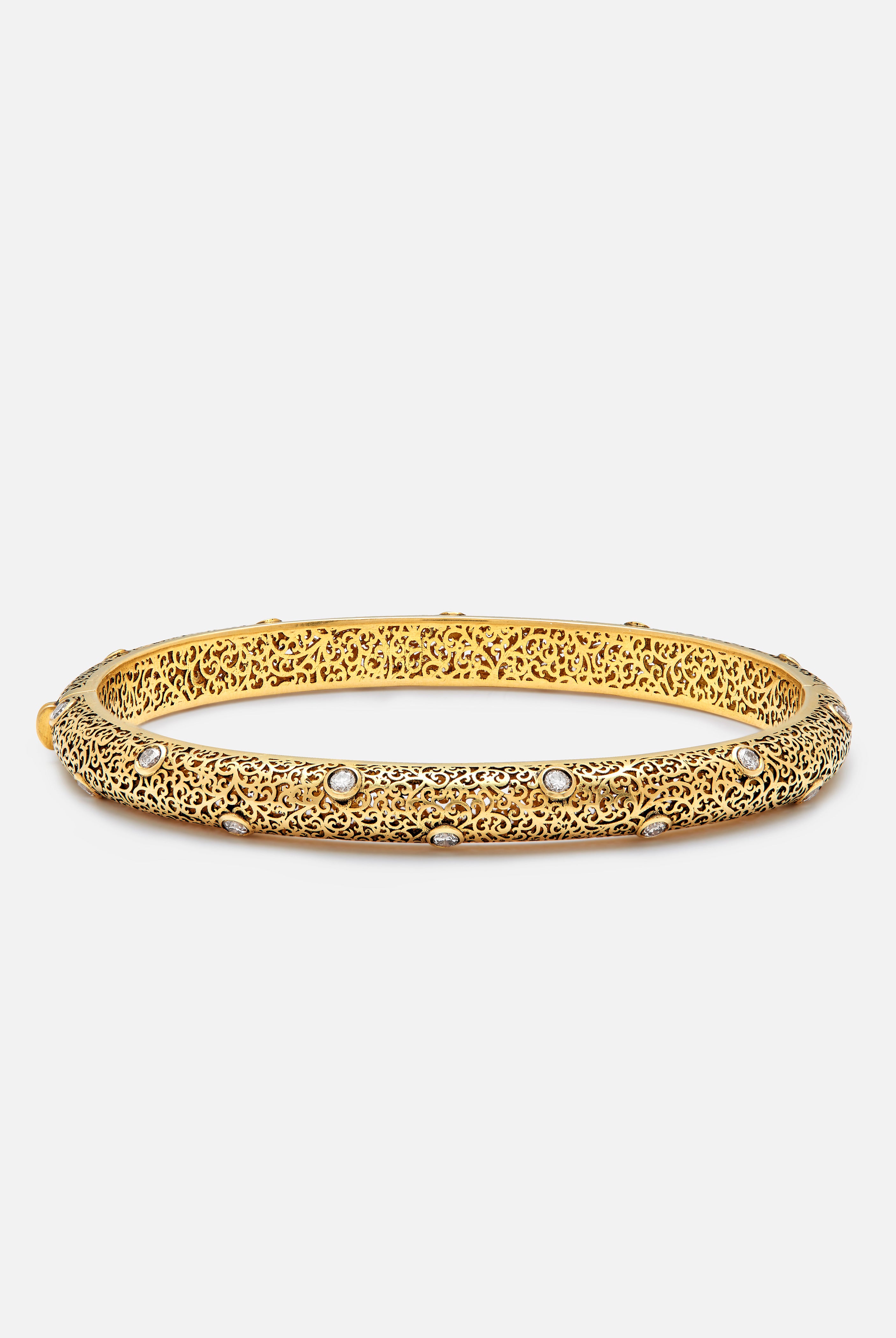 Famous in East-Asian architecture, the Jalis a latticed screen or perforated stone usually with an ornamental pattern constructed through the use of calligraphy and geometry. These intricate patterns and floral designs inspire our Jali collection, which is bold yet delicate in its appearance. The 18k gold pieces use filagree silhouettes and are scattered with diamonds for a subtle yet elevated look.
