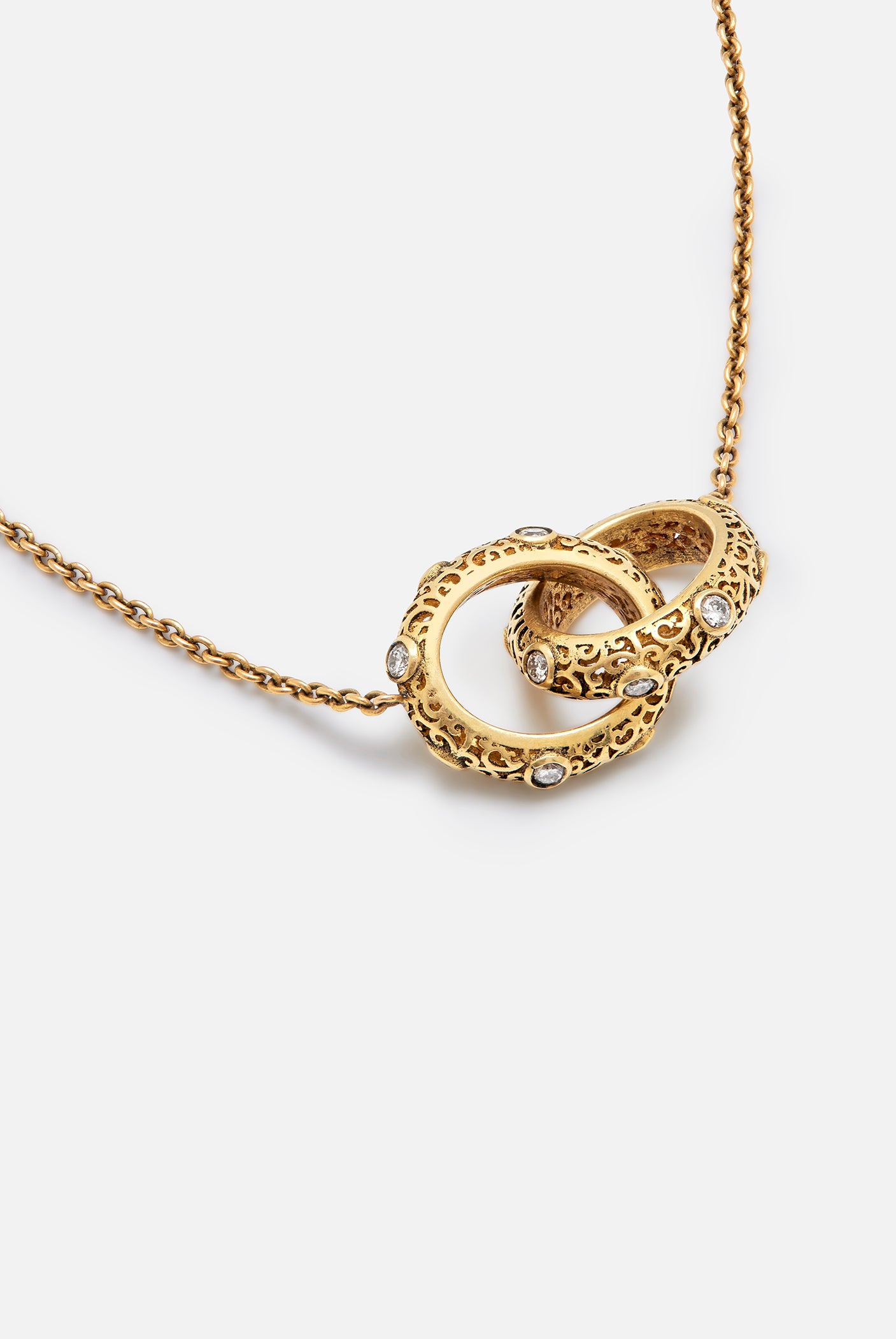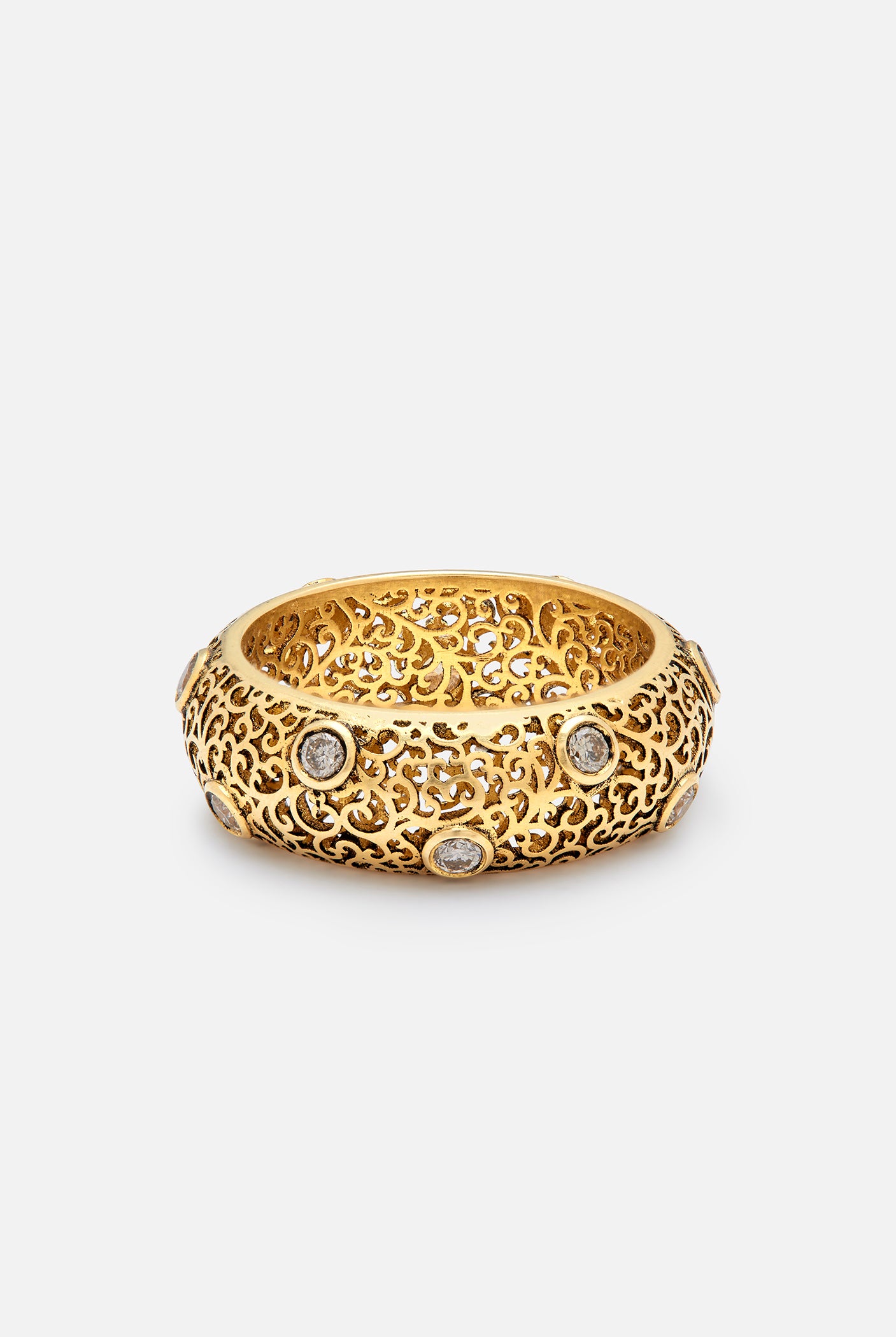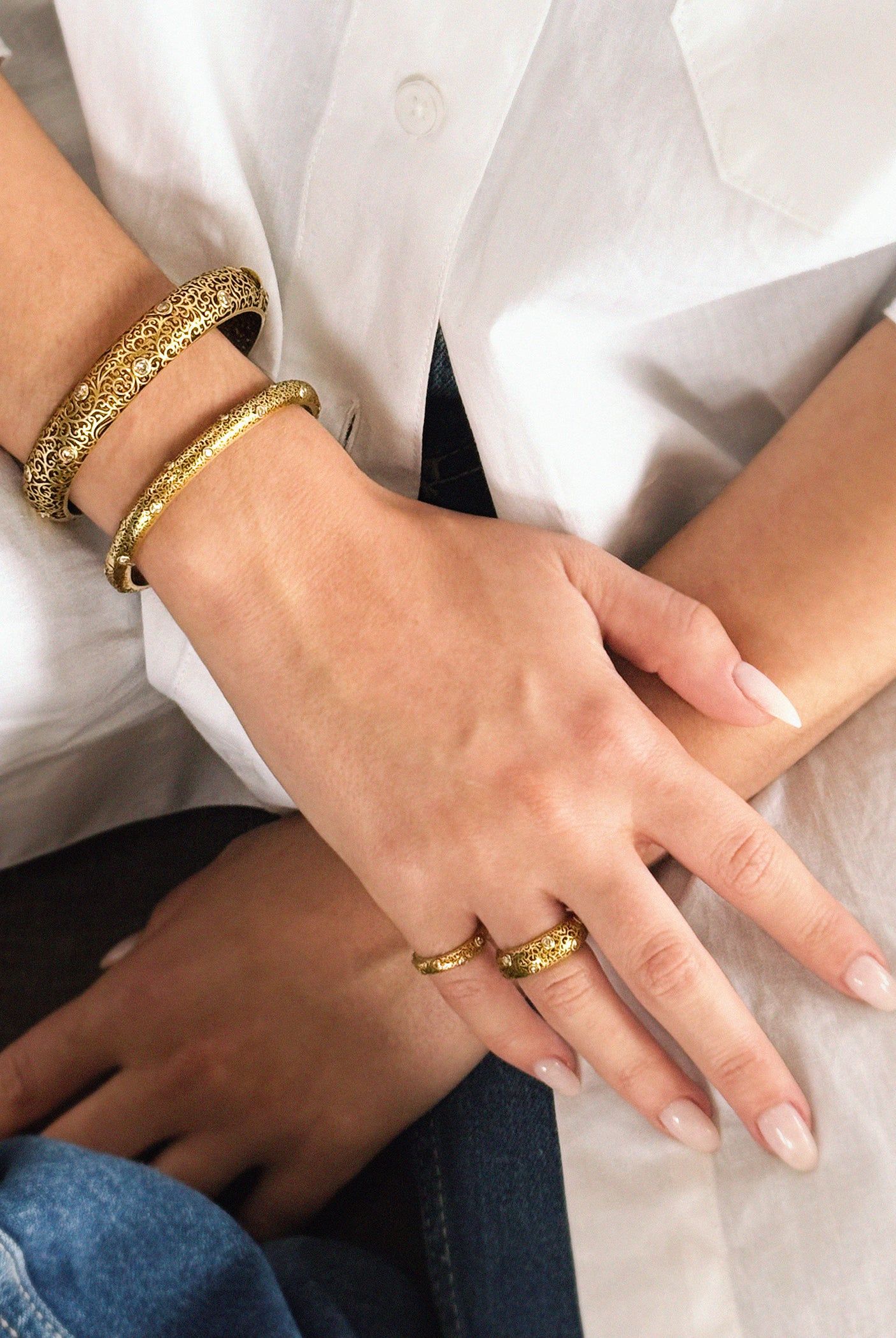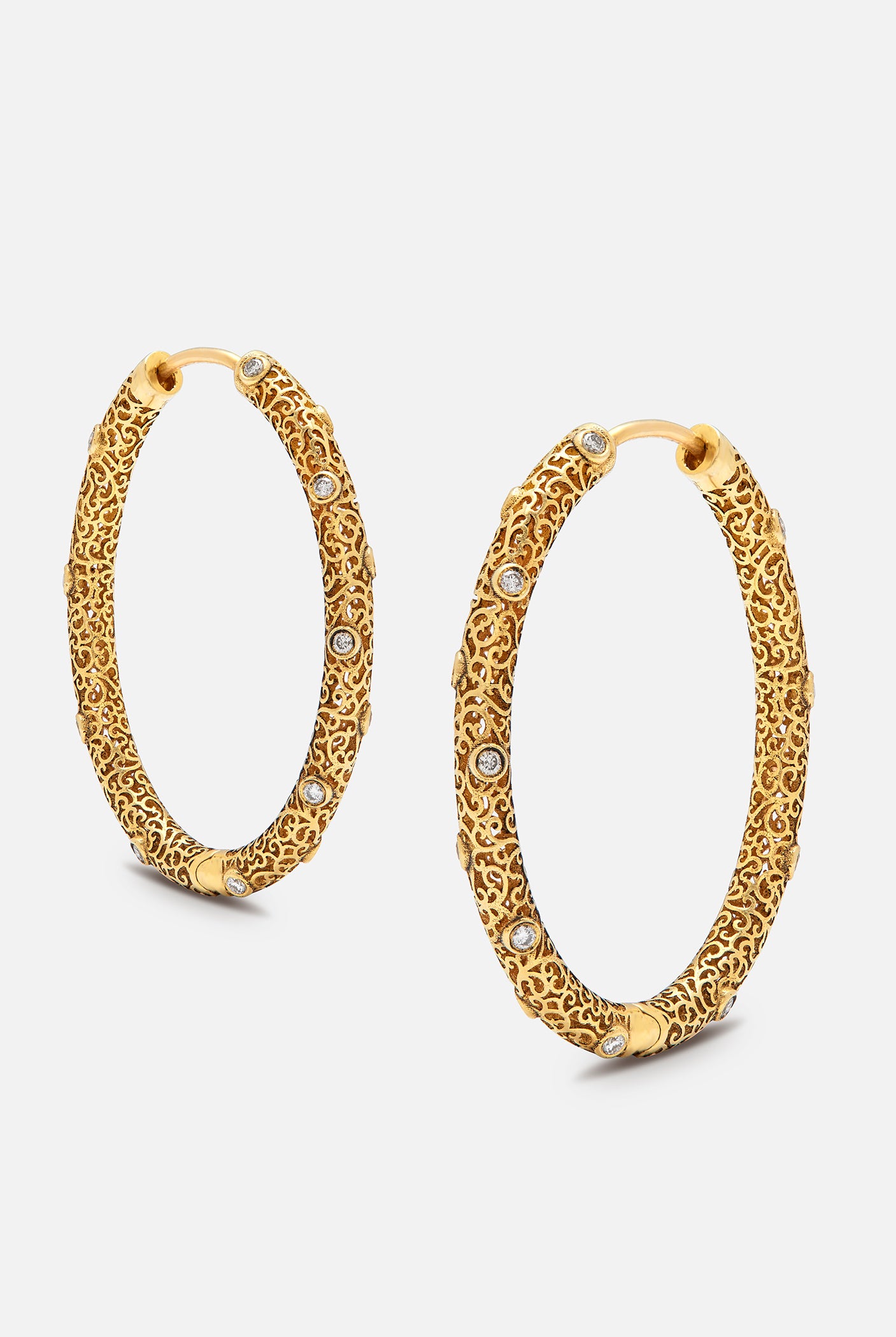 Famous in East-Asian architecture, the Jalis a latticed screen or perforated stone usually with an ornamental pattern constructed through the use of calligraphy and geometry. These intricate patterns and floral designs inspire our Jali collection, which is bold yet delicate in its appearance. The 18k gold pieces use filagree silhouettes and are scattered with diamonds for a subtle yet elevated look.