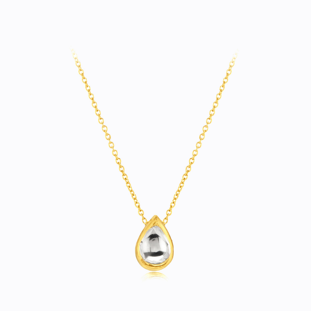 Expertly handcrafted in 18K yellow gold, the pendant showcases a teardrop motif, merging soft curves with timeless elegance. The Polki diamond is meticulously set using the centuries-old Kundan technique, ensuring maximum brilliance and durability.