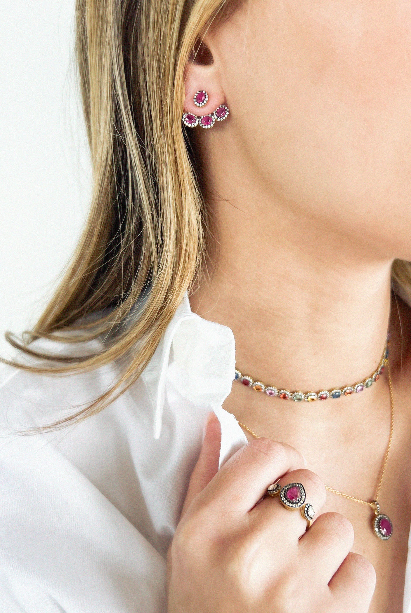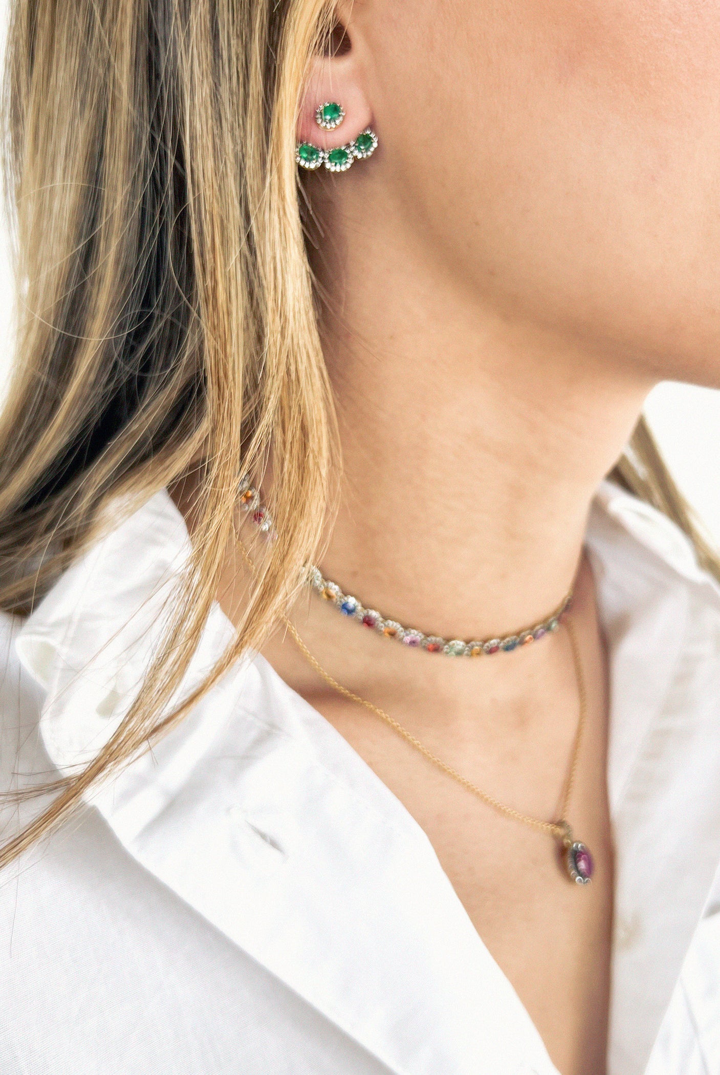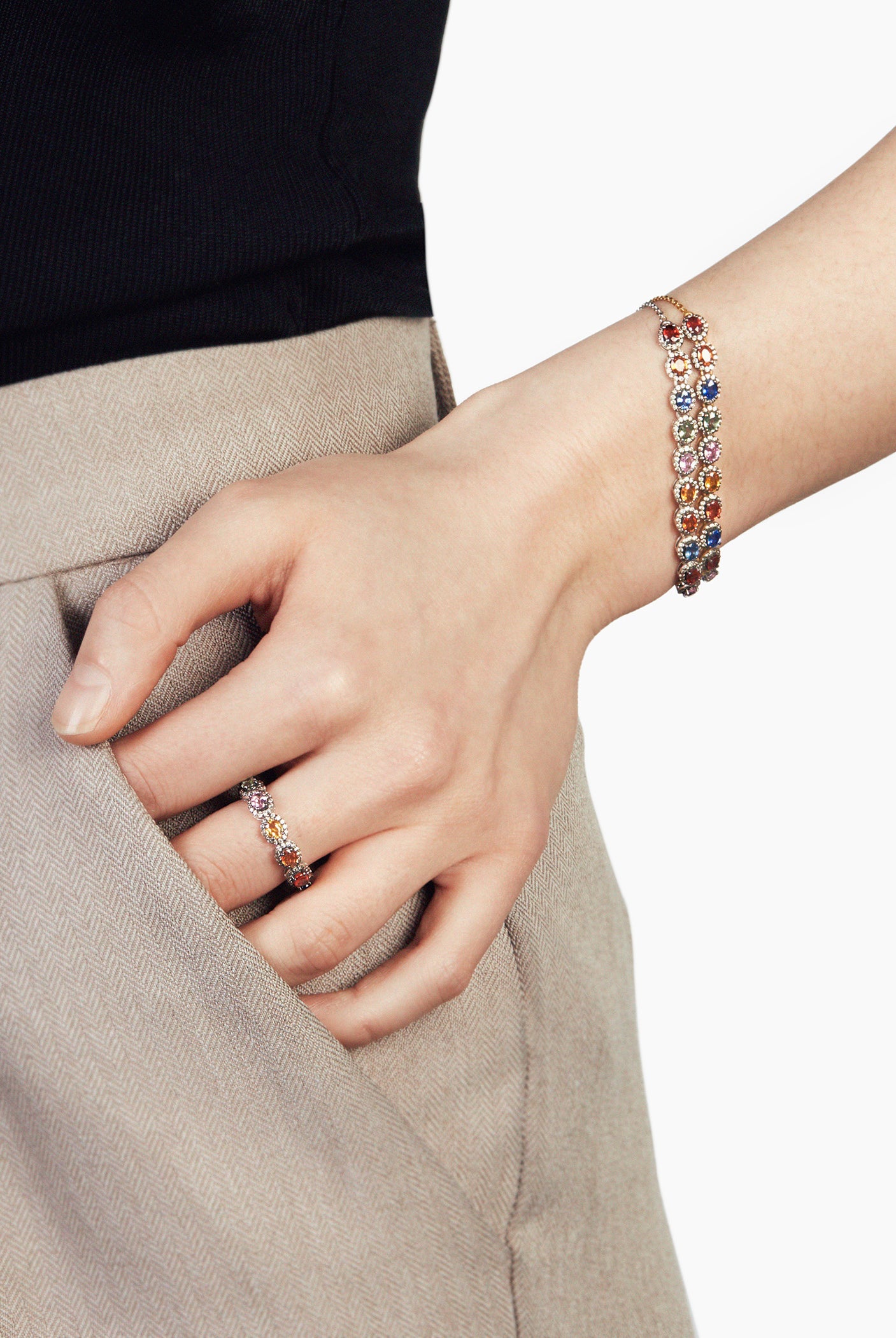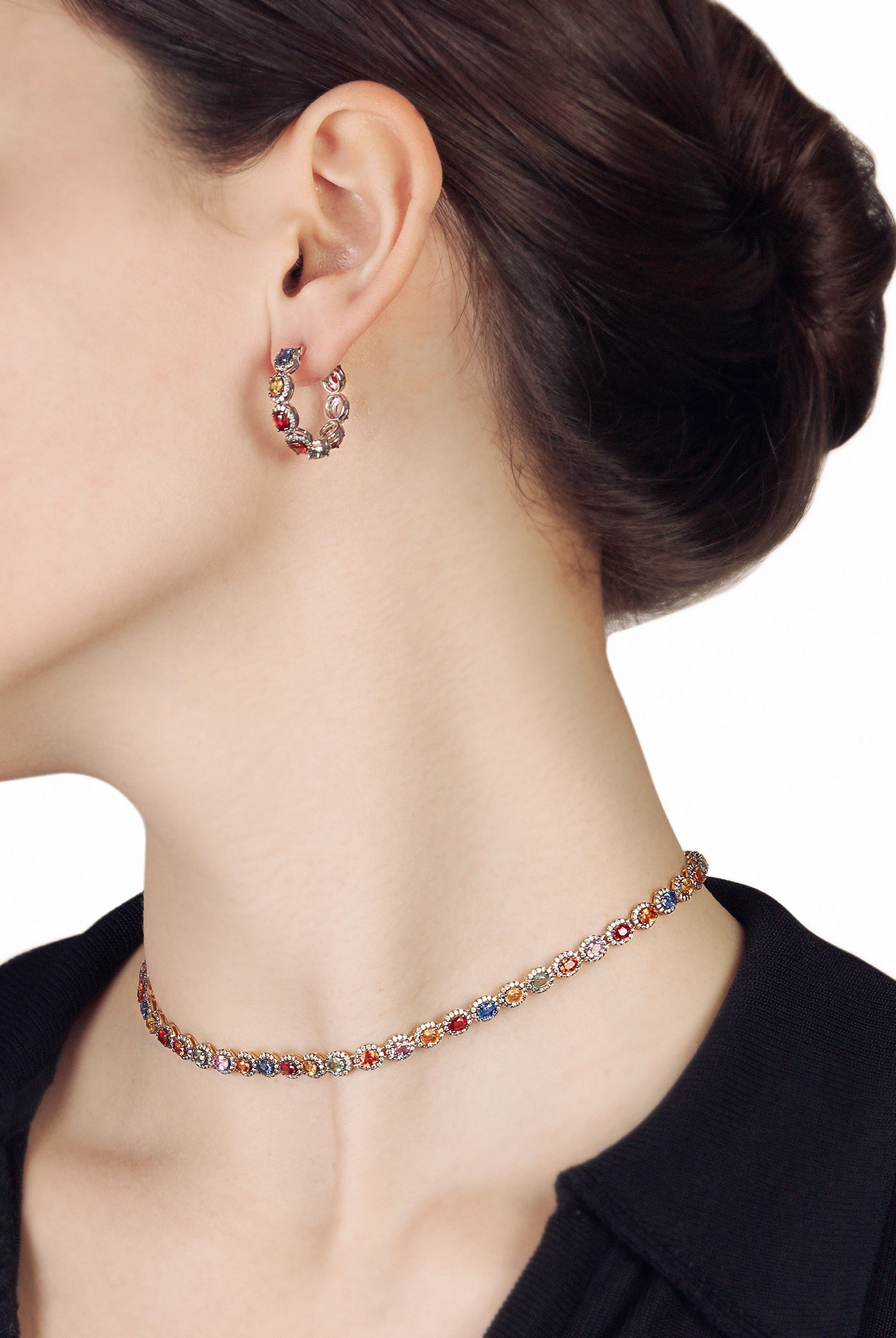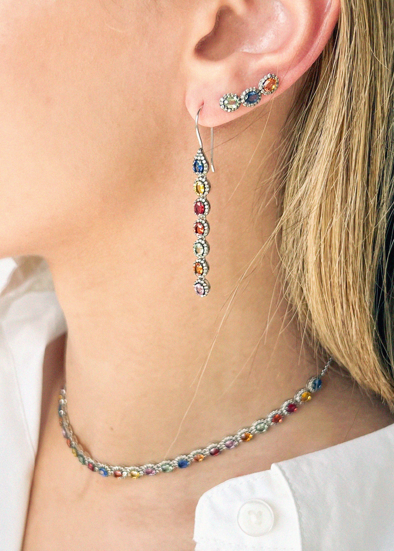 Discover the enchanting allure of Mini Rajasthan, a collection that pays homage to the timeless beauty of Rajasthan's architecture and the rich character of its people. Each piece in this vibrant collection features a stunning array ofmulti-colouredsapphires, delicately set in exquisite 18k gold with a touch of black rhodium. This nod to traditional designs found in oxidized silver and gold mixshowcasesthe perfect blend of modern elegance and the classic essence of Rajasthan's heritage.