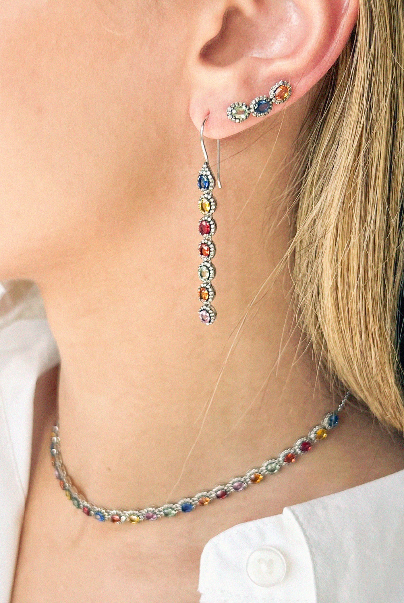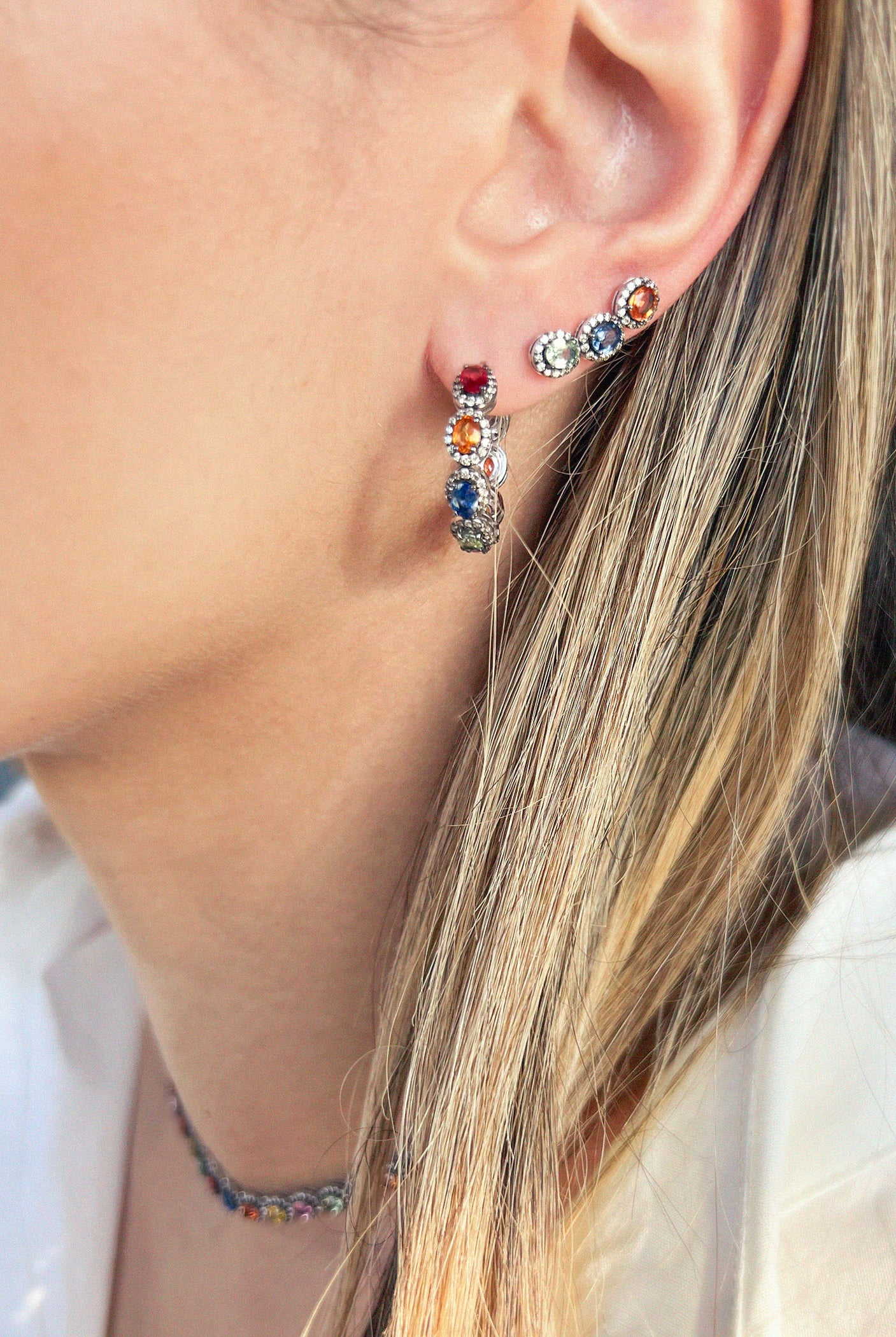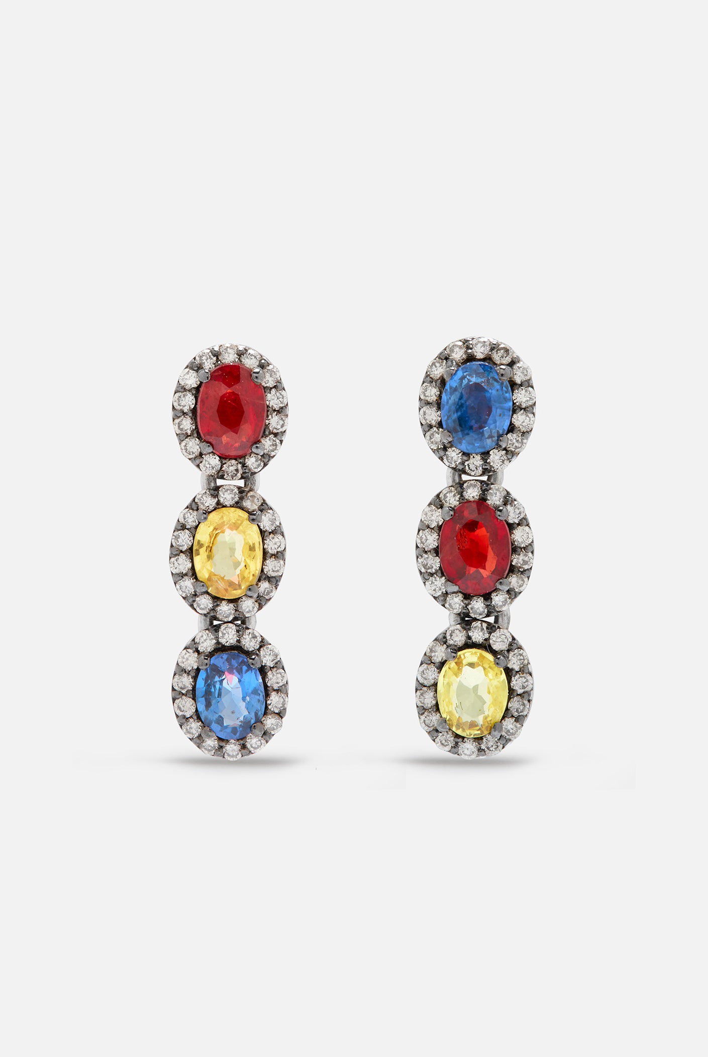 Discover the enchanting allure of Mini Rajasthan, a collection that pays homage to the timeless beauty of Rajasthan's architecture and the rich character of its people. Each piece in this vibrant collection features a stunning array of multi-coloured sapphires, delicately set in exquisite 18k gold with a touch of black rhodium. This nod to traditional designs found in oxidized silver and gold mix showcases the perfect blend of modern elegance and the classic essence of Rajasthan's heritage.