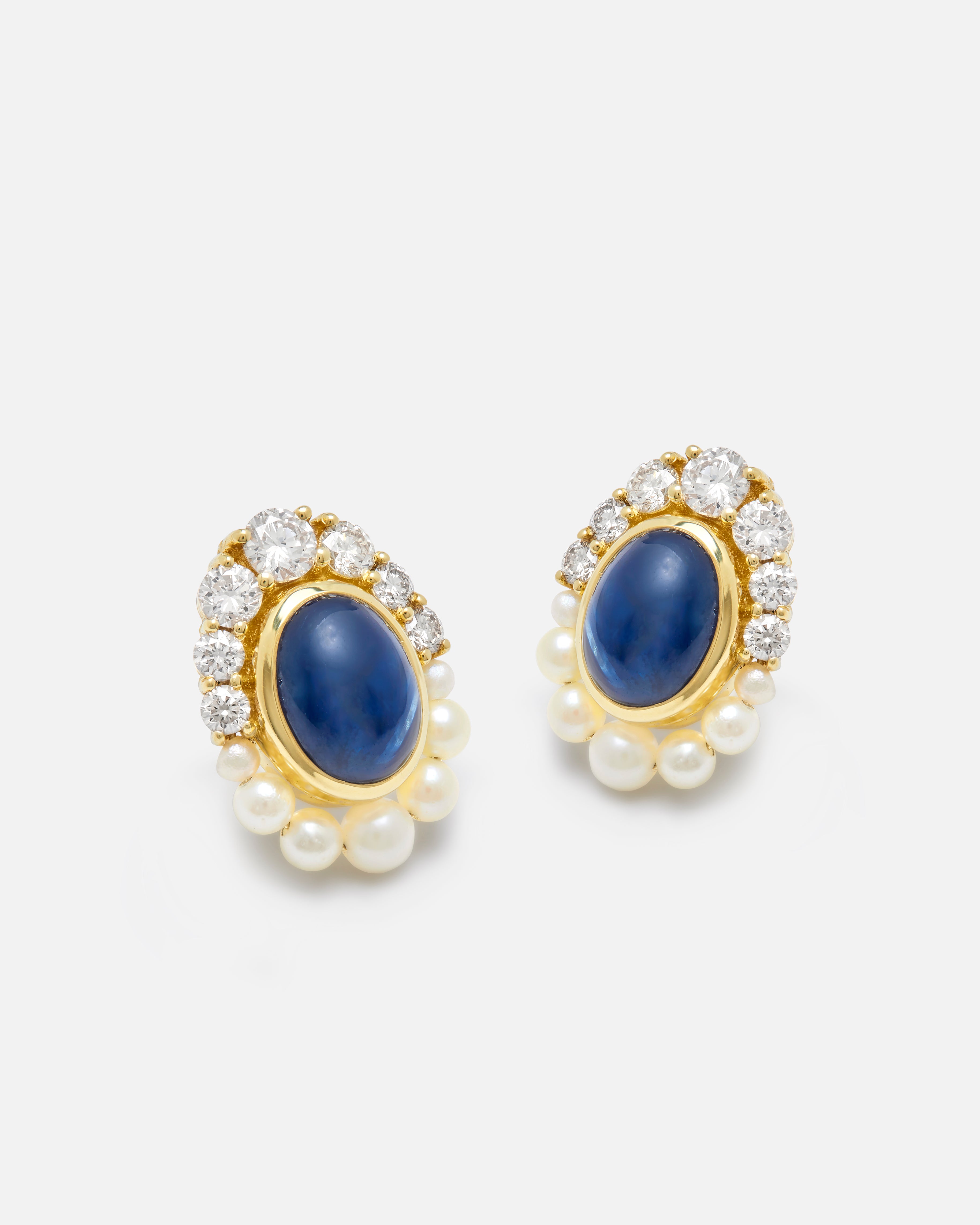 - Gemstones: These earrings consists of a stunning arrangement of diamonds and pearls with cabochon blue sapphires.