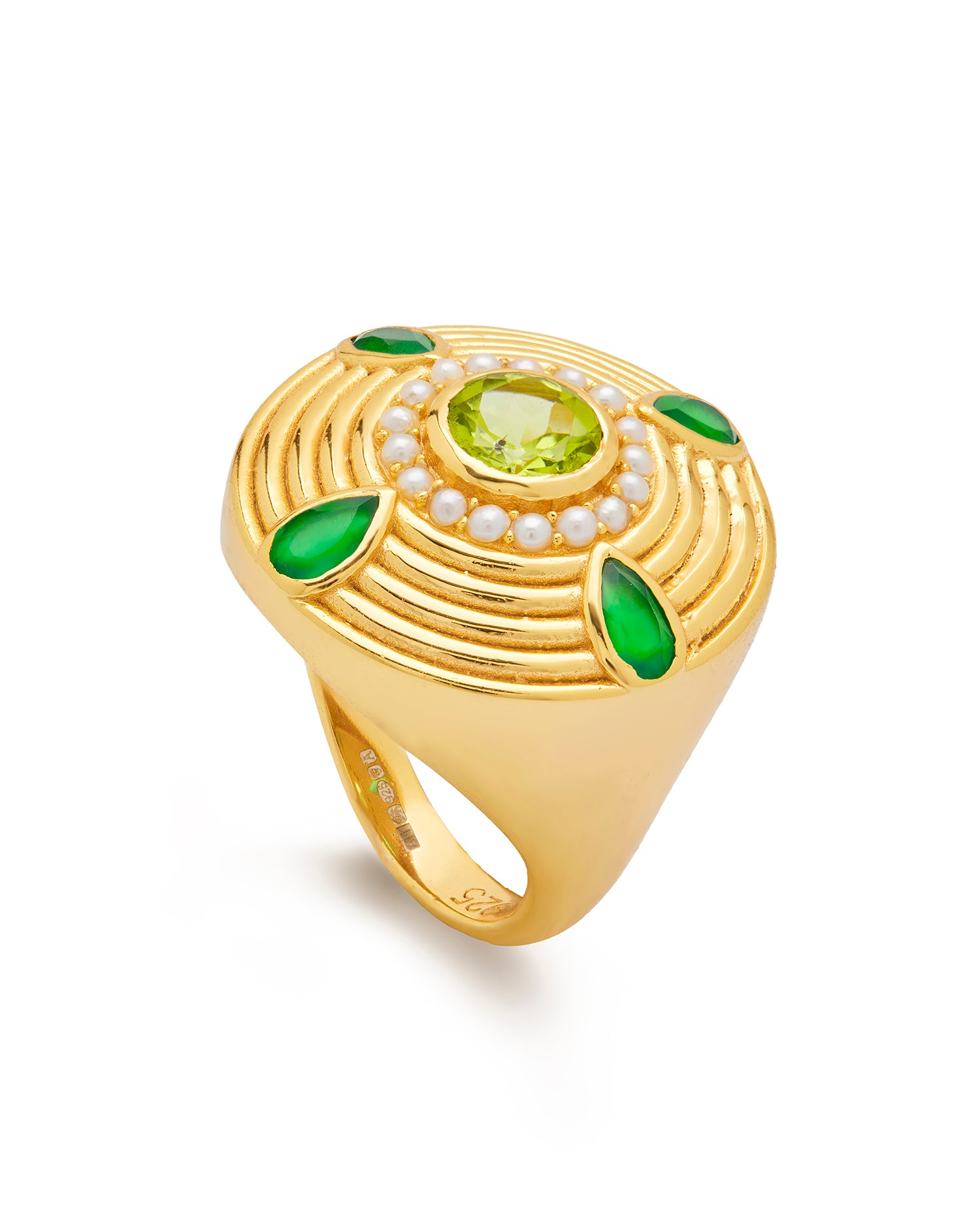 At its centre sits a vibrant peridot gemstone, accented by green onyx and luminous pearls. Wear it alone for a striking statement or stacked with other rings from the Anya Collection for layered elegance.