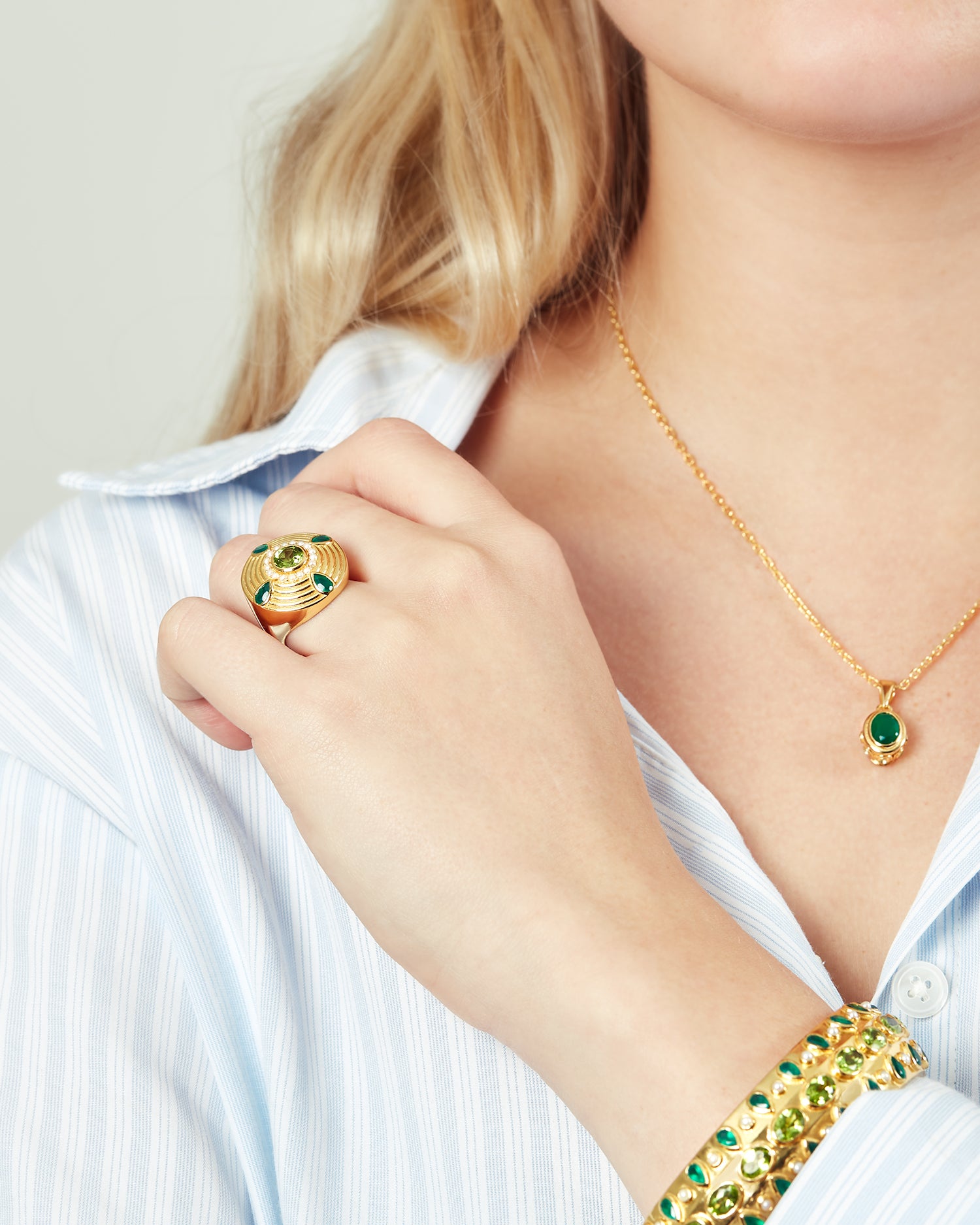 Anya Bangle with Pearl, Green Onyx & Peridot – 24K Gold Plated Sterling Silver Bangle