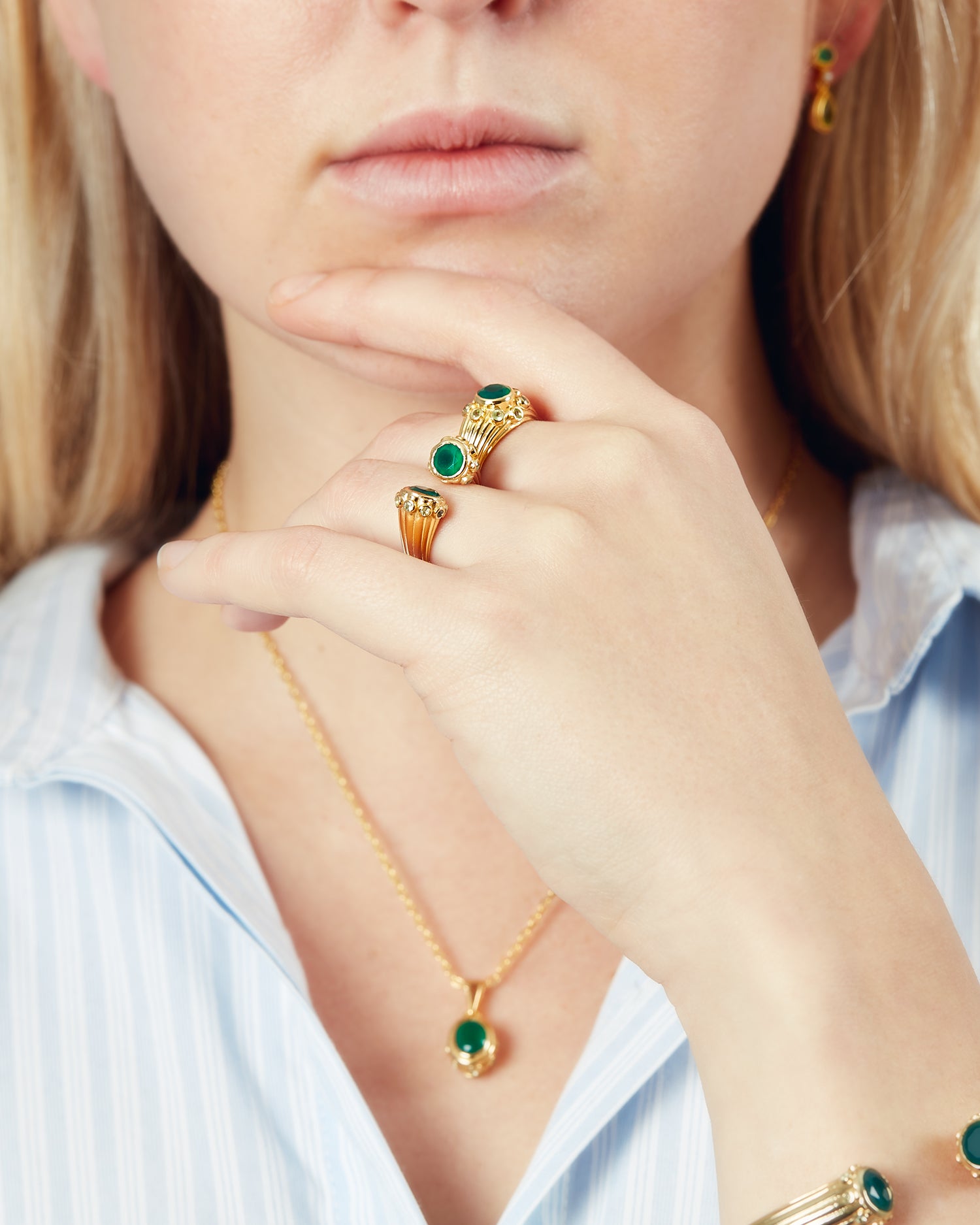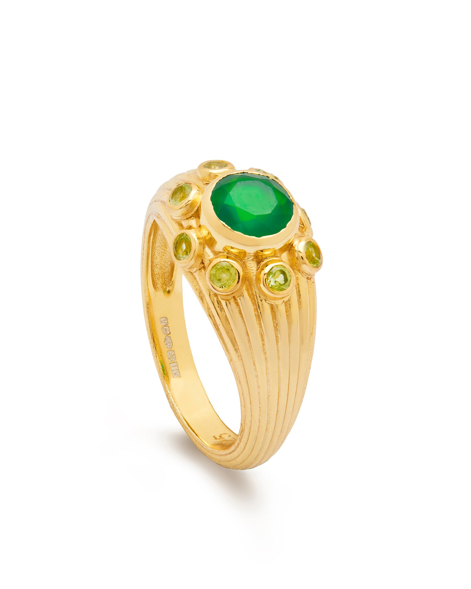 At its heart lies a glowing Green Onyx stone, embraced by peridot, infusing rich color with polished sophistication. Whether worn alone as a statement piece or layered with other favourites from the Anya collection, this ring adds a refined yet expressive touch to any ensemble.