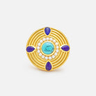 At its centre sits a vibrant turquoise gemstone, accented by deep lapis lazuli and luminous pearls. Wear it alone for a striking statement or stacked with other rings from the Nila Collection for layered elegance.