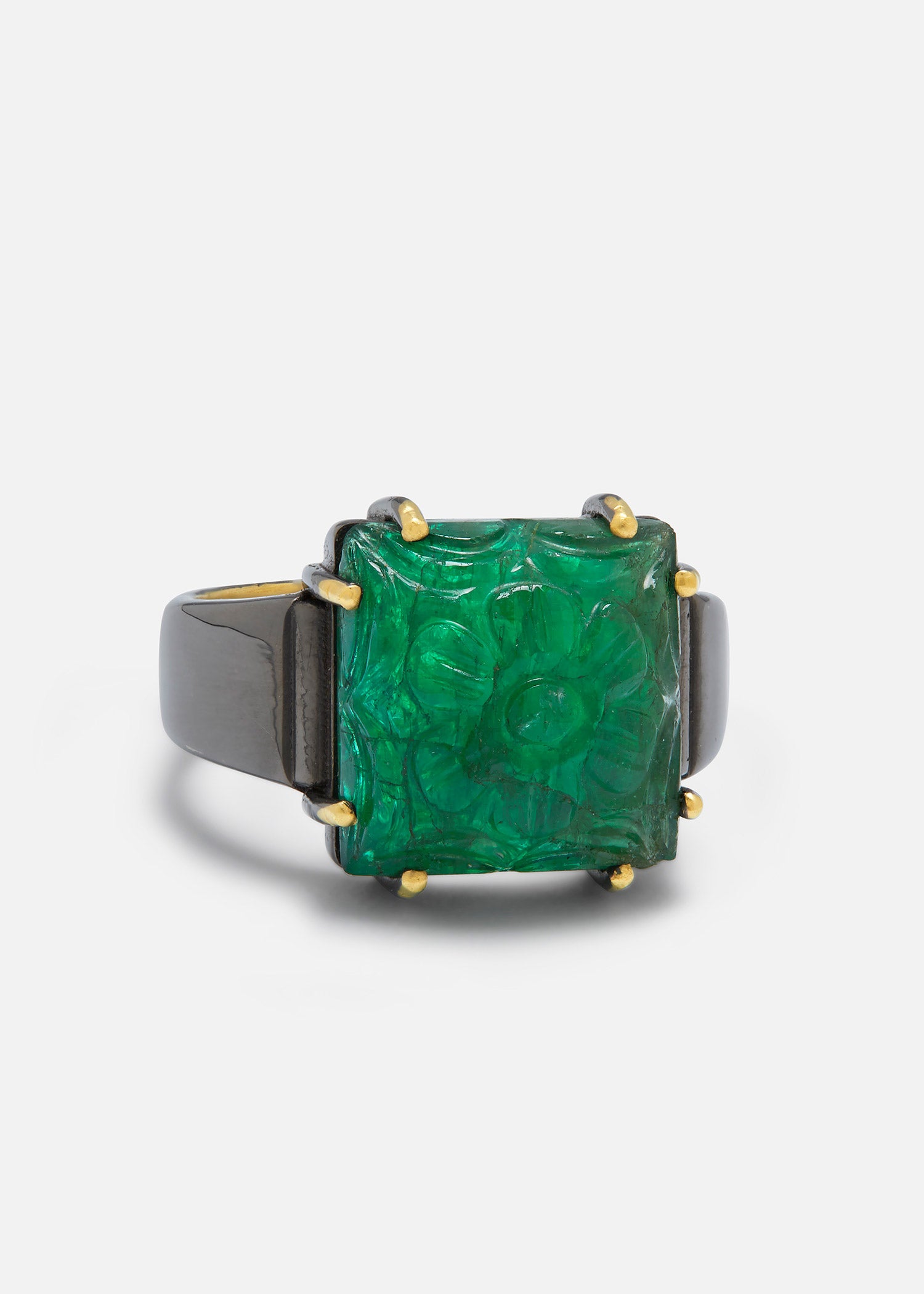 18k Yellow Gold and Black Rhodium Mens Panna Ring with Carved Emerald