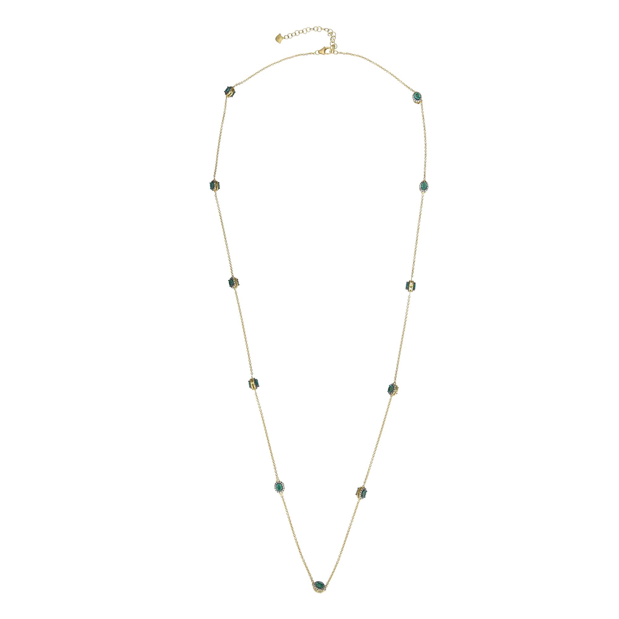 The necklace features a curated selection of natural emeralds, totalling 3.16 carats, elegantly spaced along a refined gold chain. Accentuating the gemstones are 1.34 carats of round brilliant-cut diamonds, adding a rhythmic dance of light to each "station." This combination of colour and sparkle makes the piece perfect for both standalone elegance and sophisticated layering.