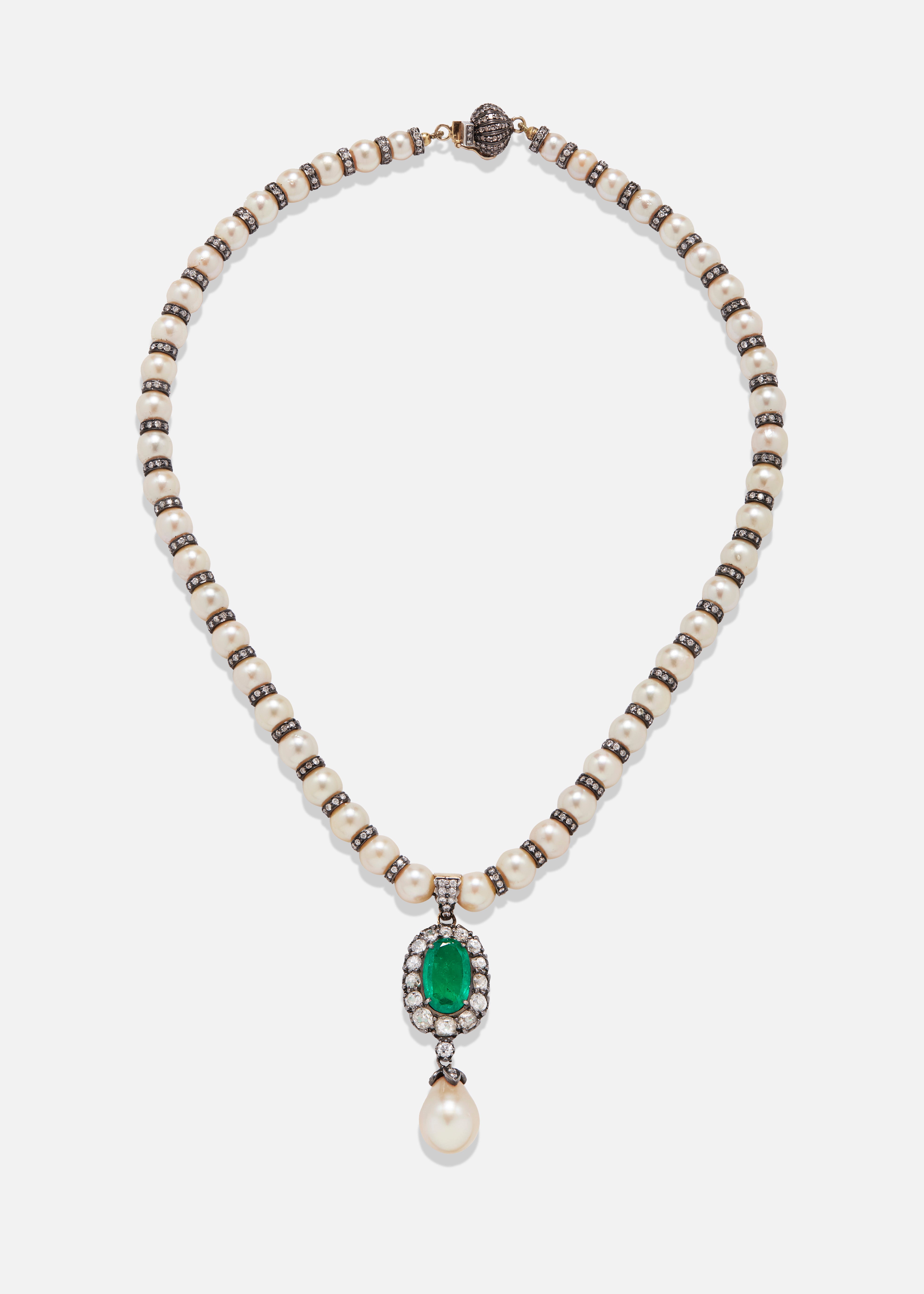 18K Yellow Gold and Black Rhodium Rajasthan necklace with Pearl and Emerald.