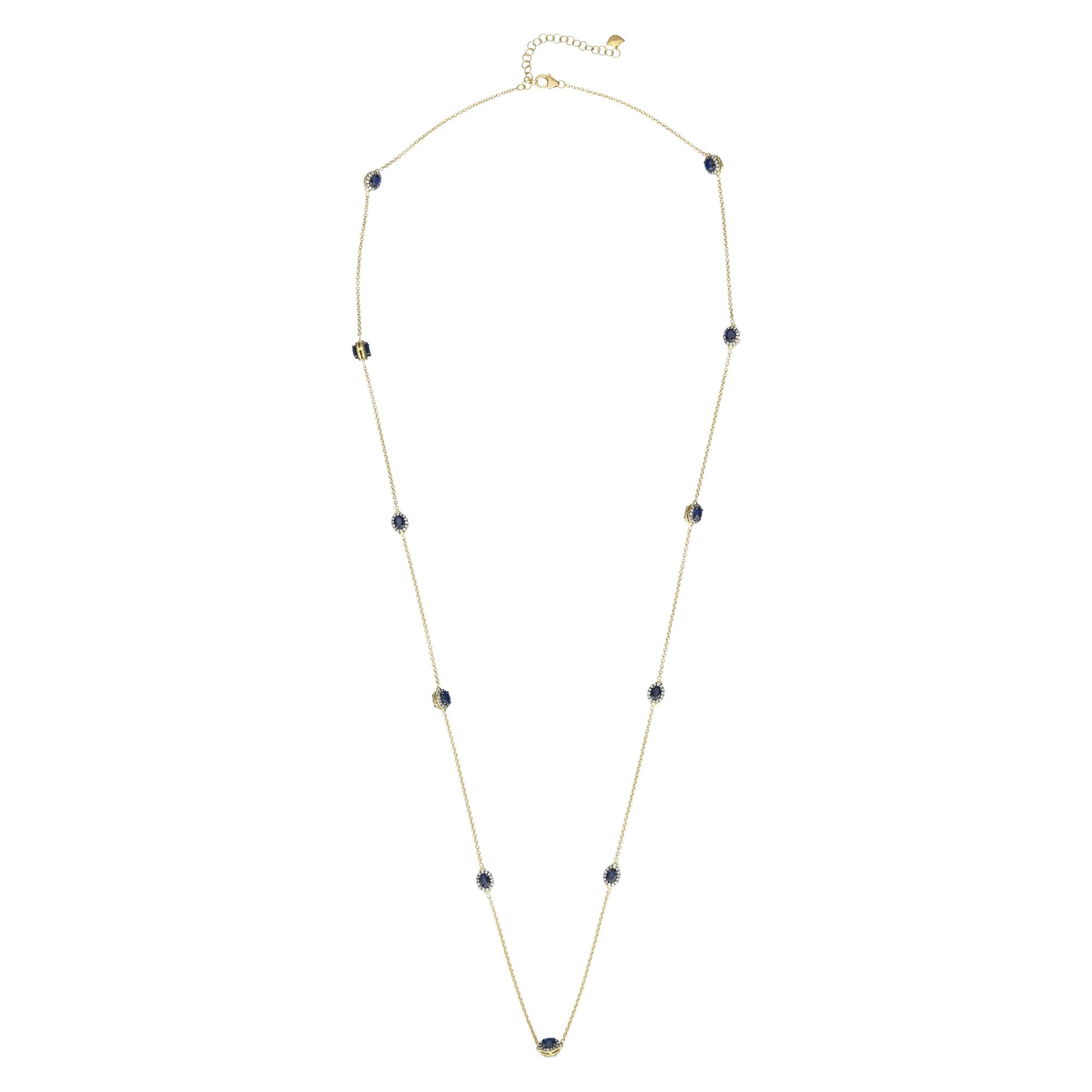 The necklace features a curated selection of natural blue sapphires, totalling 5.27 carats, spaced elegantly along a refined 28-inch gold chain. Each sapphire "station" acts as a focal point of colour and light, making this piece perfect for both standalone elegance and sophisticated layering.