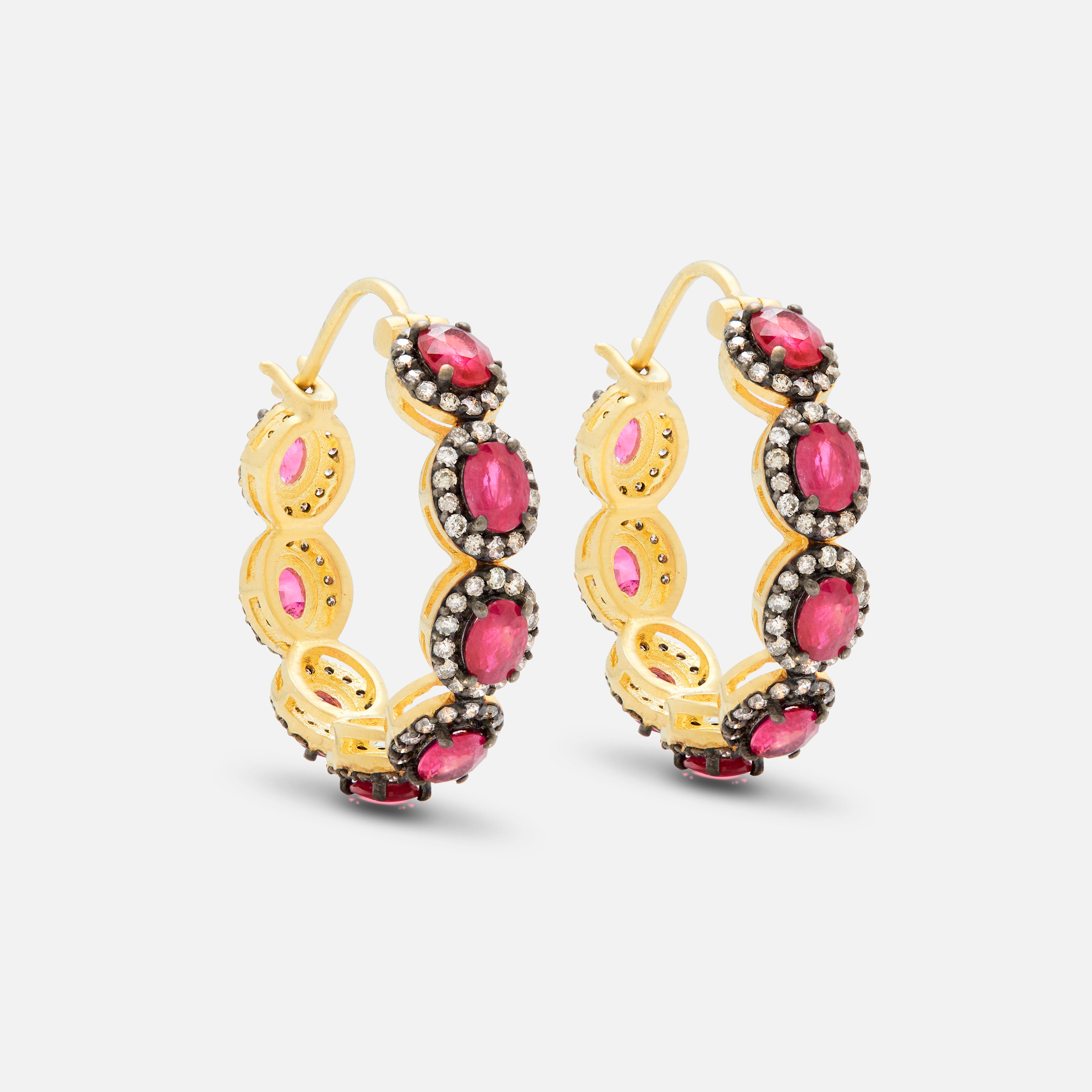 These ruby hoops are the ultimate statement accessory. Pair them with a classic black dress to let the deep red gemstones and warm gold provide a bold, sophisticated focal point.