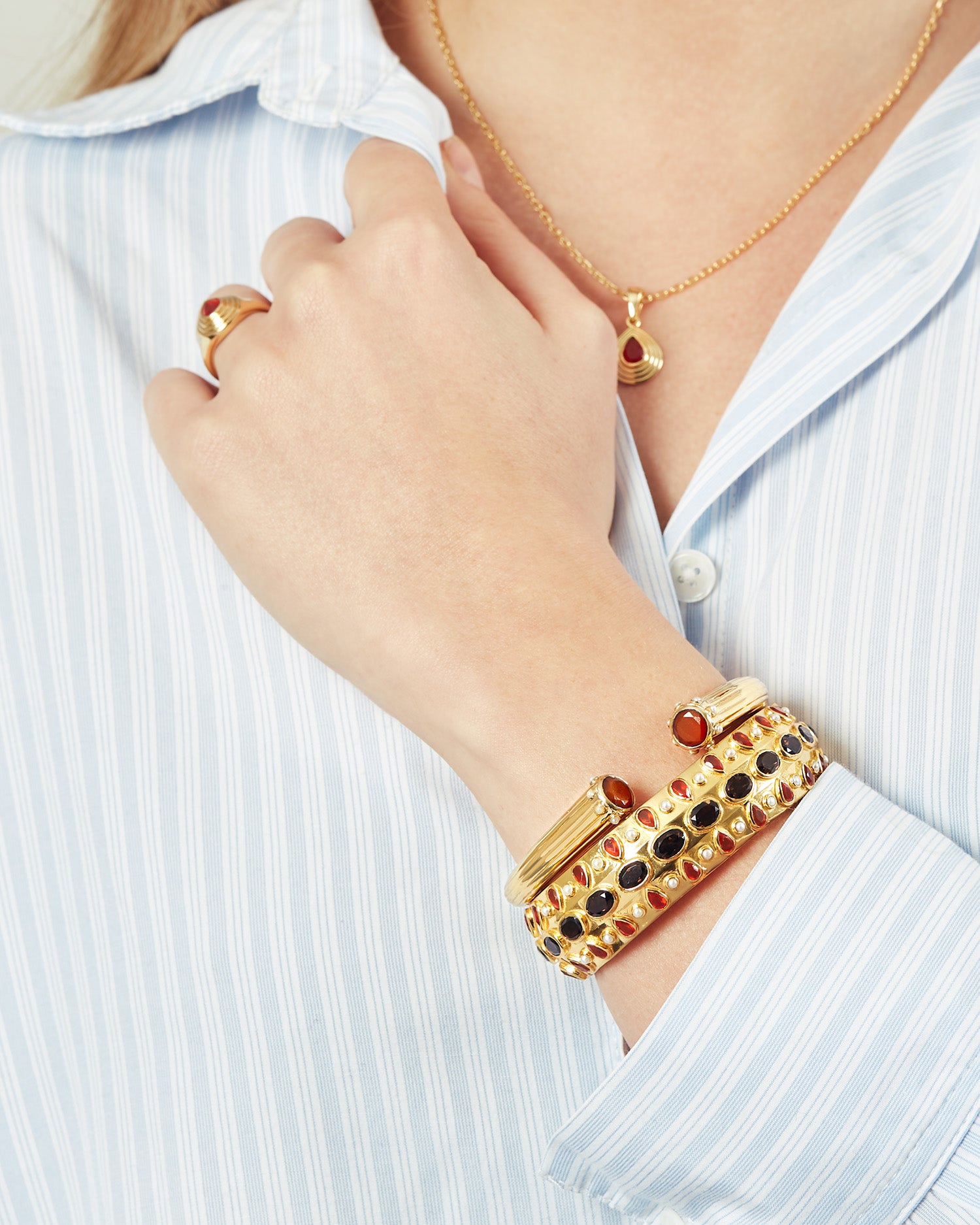 Anya Bangle with Pearl, Red Onyx & Smokey Quartz – 24K Gold Plated Sterling Silver Bangle