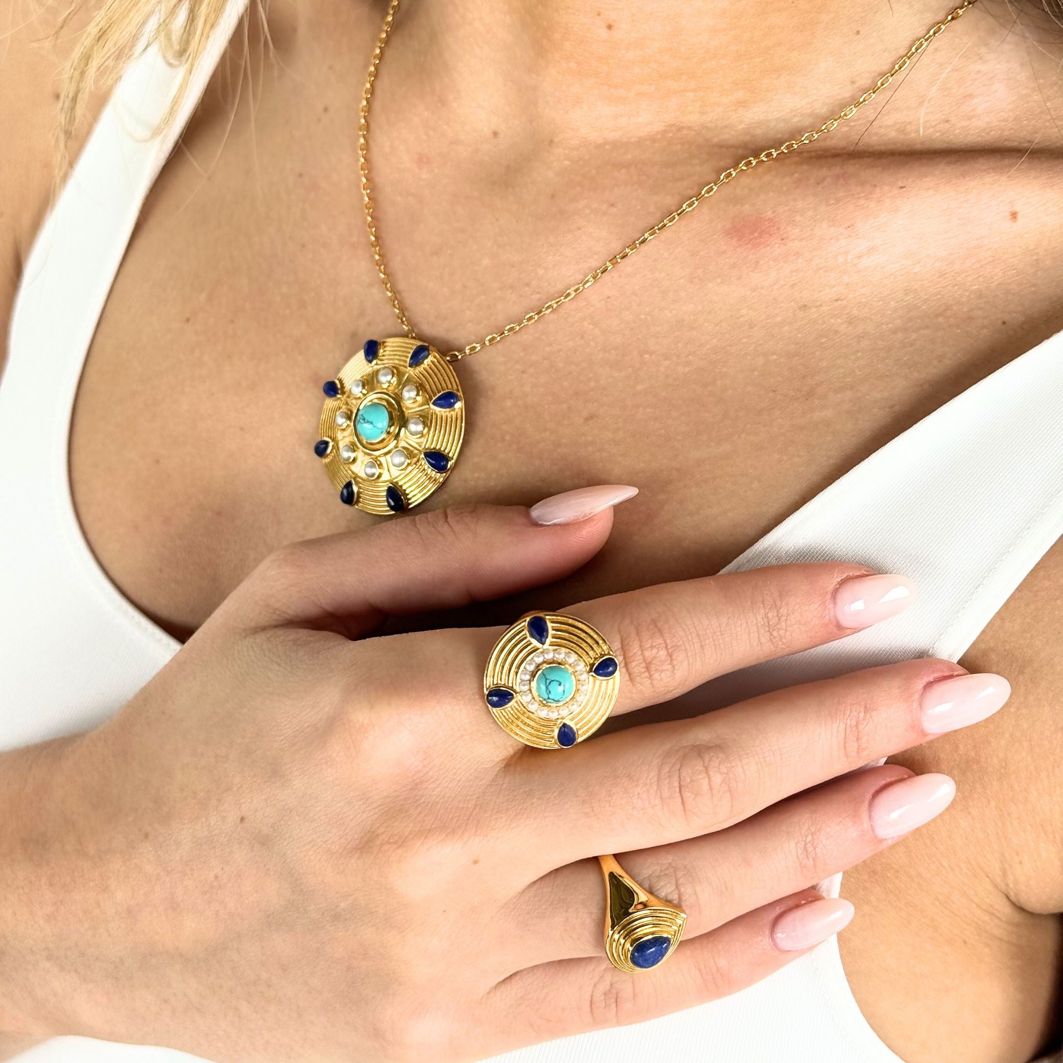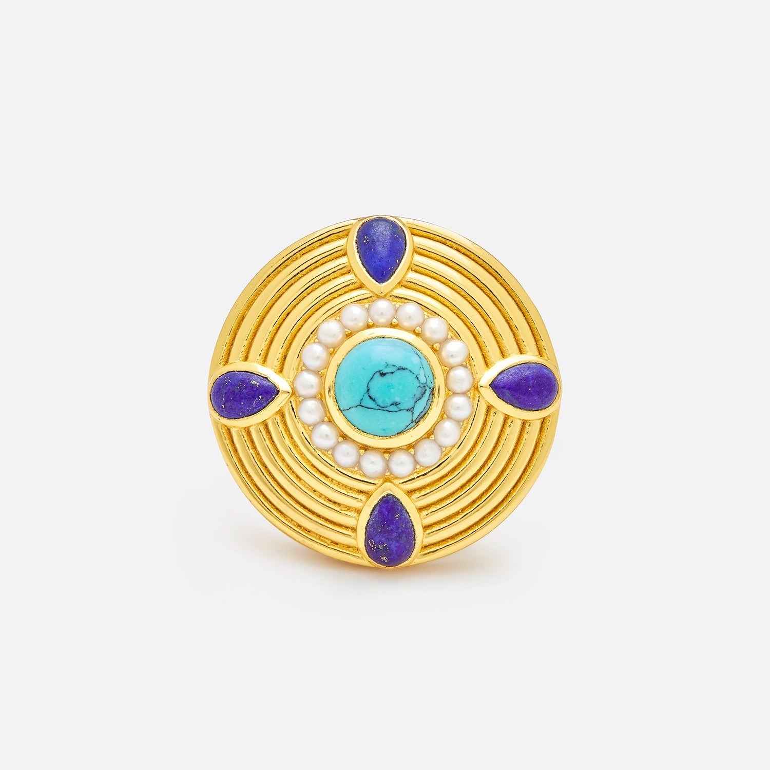 At its centre sits a vibrant turquoise gemstone, accented by deep lapis lazuli and luminous pearls. Wear it alone for a striking statement or stacked with other rings from the Nila Collection for layered elegance.